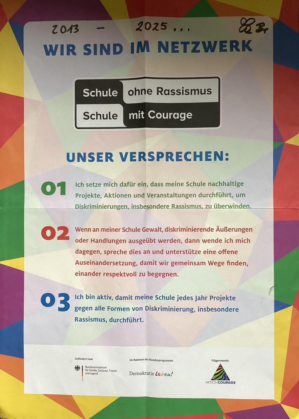 Unsere Schule hat 2014 bei einem Festakt mit dem damaligen Paten Rafik Schami diese Versprechen gegeben. Daher haben wir unsere Plakette erhalten, die bei uns über dem Glaskasten hängt.