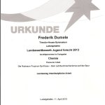 Auch im Bundeswettbewerb von Jugend forscht 2013 hat Frederik Dumele die Juroren von seiner neuen Tropinon-Synthese überzeugt: Er erhielt zusätzlich zum Sonderpreis nun auch noch den 2. Preis im Fachgebiet Chemie (2.000 €, gestiftet vom Fonds der Chemischen Industrie)!