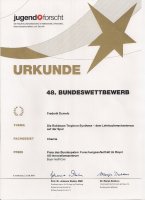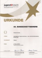 Bei der starken Konkurrenz schon ein tolles Ergebnis, denn im Fachgebiet Chemie waren ja schließlich insgesamt 9 Projekte vertreten, während es im Bereich Arbeitswelt, Geo- und Raumwissenschaften, Mathematik/Informatik und Physik jeweils nur maximal 4 Arbeiten waren, die beim Landeswettbewerb präsentiert werden durften.